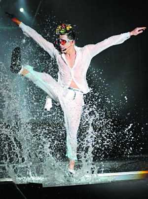 作為系列演唱會的保留項目,這次水花舞林表演環(huán)節(jié)賦予不少新的東西,首先是首次在T臺上表演,更加拉近與觀眾的距離;其次是前晚的氣溫只有10℃,在如此低溫的環(huán)境下“玩水”會令人更加興奮。在緩緩的流水聲中,整個舞臺被注滿了水,像一個巨型水池。在《唱這歌》的音樂聲中,身穿白色全套透視裝的郭富城現(xiàn)身跳起勁舞,水花一直濺射到臺下,觀眾也很興奮地迎水而舞,郭富城的紅色防水內(nèi)褲也都完全展露出來,盡顯誘惑味道。而最后演唱《著迷》的時候,郭富城更用毛巾拍打舞臺的水,產(chǎn)生更多水花,將觀眾的熱情推向高潮。