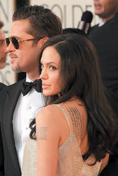 銀色情侶檔布拉德·皮特與安吉莉娜·茱莉雙雙入圍金球獎(jiǎng),俊男美女搶盡鋒頭。茱莉穿Atelier Versace禮服、露出修長(zhǎng)玉腿和戴墨鏡的皮特十指緊扣踏上星光大道,但兩人都以微笑代替說(shuō)話,連媒體想訪問(wèn)皮特,都被茱莉巧妙帶開。