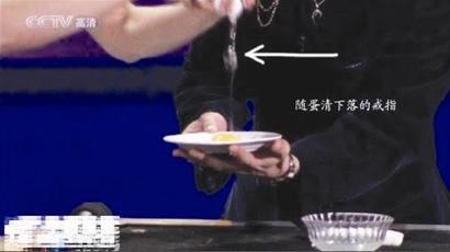 圖七,好了,這一動(dòng)作做完后,劉謙用左手接過(guò)董卿的戒指把玩一番,并問(wèn)董卿這枚戒指有多貴,這一過(guò)程,劉謙很自然地把戒指放到了右手,注意,是塞到了右手的食指和拇指中間,因?yàn)橛沂值氖持负湍粗钢虚g已經(jīng)捏著個(gè)被皮筋拉扯的掛鉤,塞進(jìn)戒指后他用左手扭動(dòng)著戒指,好像在做下意識(shí)的動(dòng)作,其實(shí),是把戒指環(huán)掛到那個(gè)掛鉤上,這一動(dòng)作是在右手的食指和拇指“捏合”之中完成的,觀眾是看不到的,由于角度的原因,觀眾也看不到那根細(xì)細(xì)的皮筋。