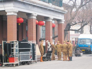 除了道具和布景以外,另一邊演員和造型師也忙得不可開交,記者在現(xiàn)場看到,造型師正一遍又一遍地檢查著各位演員的服飾和妝容,并且還要對每一雙鞋進行做舊處理,以達到最佳拍攝效果。當看到幾位群眾演員的軍裝領口,露出不符合時代背景的內(nèi)衣后,就立刻要求他們脫下。記者看到,就連每一位群演的化妝也都細致入微,有的因為要調(diào)整膚色將粉底涂至脖子根部,有的被化妝師在臉上做出了好似疤痕的效果,更有甚者,因為發(fā)型不符合電影故事發(fā)生年代,竟被發(fā)型師當場剃成“板寸”。記者在現(xiàn)場還看到幾位候場的日本演員,敬業(yè)的他們在開拍前很久便開始對著鏡子反復練習。