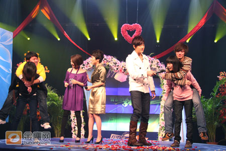 完美的“新娘抱”過后,粉絲的熱情只增無減,演播廳的大屏幕又很是適宜的播放鄭元暢、林依晨主演的偶像劇《我的愛情面包》中,鄭元暢橫抱林依晨參加耐力比拼游戲的片段。主持人張丹丹提議現(xiàn)場派出四名粉絲(兩男、兩女)上臺來玩“耐力大比拼”的游戲。搞怪的鄭元暢更是提議游戲中,由女生背男生進行游戲,增加比賽難度。
