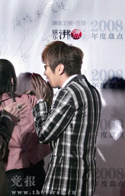 昨晚,首先走上紅毯的就是JJ林俊杰,他先是“護(hù)送”著阿Sa和容祖兒出場,待兩人和主持人“接頭”之后,又趕回了紅毯的始發(fā)地,迎接自己公司力捧的兩位小師妹BY2。不過忙中出亂,想在簽名板上簽下“海蝶家族”的他一時(shí)間寫成了“海蝶家且”,發(fā)現(xiàn)不妙后立即把且劃掉了,寫下了族,搞得臺下的影迷們緊張了半天。