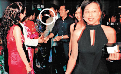 對于Karen早前指T富商與她相好時一直隱瞞有家室,T富商前日展示了兩張02年其正室次子結(jié)婚時的照片,原來當(dāng)時Karen也出席了這個婚宴,而且還與T富商的正室握手。T富商說:“02年我兩個做保險的女性朋友介紹下認(rèn)識Karen,后來我兒子結(jié)婚,我就請她來。所以她怎么會不知我有家室呀?”