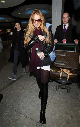 林賽·羅韓黑色皮衣配紫色彩襪 帥氣難擋(組圖)