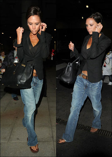 當(dāng)天的維多利亞·貝克漢姆身穿黑色西裝外套,里面則是搭配了黑色露臍抹胸,下面穿了肥大的牛仔褲,小編驚奇的發(fā)現(xiàn),維多利亞居然當(dāng)天沒有穿高跟鞋,而是換了平底的拖鞋,很是少見,難道貝嫂轉(zhuǎn)性啦??? 但是連高跟鞋都可以脫掉的貝嫂絕對(duì)不變的就是那張黑臉了。