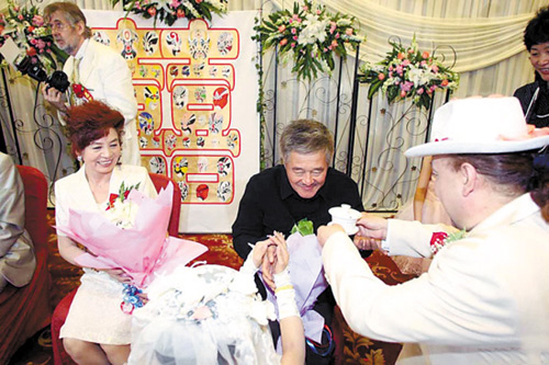 婚禮顯得十分節(jié)儉,選擇在一家四星級酒店舉行,筵開10席,只邀請了包括趙本山在內(nèi)的親朋好友,連新娘子的化妝都是由贊助商“買單”。在婚禮現(xiàn)場,一對新人的婚紗照被做成真人大小的展架,其中既有經(jīng)典的西裝婚紗照,也有頗具中國傳統(tǒng)風(fēng)格的大紅喜服裝束。據(jù)了解,博比·肯出生在烏克蘭一個藝術(shù)世家,2001年,他在電視上看了趙本山的小品,“被其深厚的藝術(shù)功底所折服”,通過熟人介紹,正式拜趙本山為師。博比·肯表示,他1992年來到中國,立刻被這里古老的文明所吸引,因此,他一早就與新娘張雯婷達成了共識:“我們要辦一個地地道道的中式婚禮!