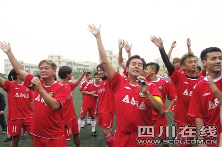 下午5時,義賽結(jié)束,現(xiàn)場出現(xiàn)感人一幕:災(zāi)區(qū)的11個學(xué)生,舉著寫有“災(zāi)區(qū)學(xué)子謝謝您!感恩奮進(jìn)!”的大牌子來到球場中間,以示謝意。在地震當(dāng)天出生的10個孩子,與明星們結(jié)上幫助對子。
