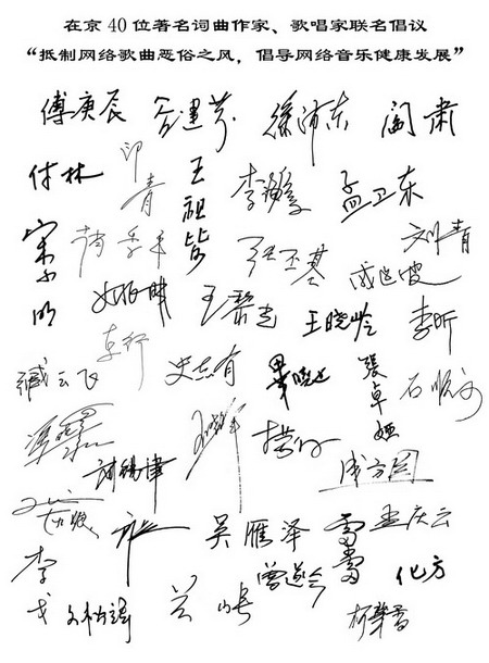 中國音樂家協(xié)會19日在京召開“抵制網(wǎng)絡(luò)歌曲惡俗之風(fēng)”座談會,與會代表痛批了以《那一夜》、《大連站》、《狼愛上羊》等為代表的網(wǎng)絡(luò)歌曲低俗化現(xiàn)象,同時,以閻肅等為代表的在京40位著名詞曲作家、歌唱家聯(lián)名發(fā)起了“抵制網(wǎng)絡(luò)歌曲惡俗之風(fēng),倡導(dǎo)網(wǎng)絡(luò)音樂健康發(fā)展”倡議書。
