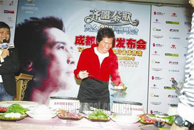 昨日新聞發(fā)布會(huì)的主題似乎是火鍋,而不是音樂(lè)。但其中的真意,齊秦非常明了:“這樣舉辦新聞發(fā)布會(huì),是想以朋友的方式和大家聊聊。在四川我做辣味火鍋拼不過(guò)你們,那我就做一個(gè)來(lái)自馬來(lái)西亞的胡椒螃蟹火鍋吧。”齊秦系上了圍裙,他面前擺滿了蟹肉、粉絲、肉丸子、蚌殼、蔬菜等燙料,5口蒸鍋正熱氣騰騰地翻滾著湯汁。曾經(jīng)在舞臺(tái)上激烈地高歌《九個(gè)太陽(yáng)》、《啞口》,曾經(jīng)長(zhǎng)發(fā)不羈的齊秦,曾經(jīng)在與王祖賢的愛(ài)情糾葛里被傳說(shuō)得沸沸揚(yáng)揚(yáng)的齊秦,昨日像足了一個(gè)居家的男人。他非常安然:“我是蠻居家的,我在成都剛剛買了房子,還想開火鍋店,我喜歡成都。”
