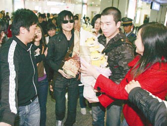 記者20:50左右抵達(dá)機(jī)場時,并沒有看見大量的“玉米”,不過21:00過,他們就從四面八方匯集到了一起——原來“玉米”們其實早就到了現(xiàn)場,不過為了防止機(jī)場方面過度 “緊張”,他們主動地化整為零,“隱藏”在了人群里。此次,“玉米”們沒有像以前那樣,穿著統(tǒng)一黃色玉米服,而是什么顏色都有,但還是組織有序,整齊地站成兩排迎接。