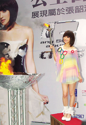 張韶涵將于12月14日推出第五張大碟《ANG 5.0》,前日,福茂唱片斥資12.5萬(wàn)人民幣為她的簽唱會(huì)打造“移動(dòng)式競(jìng)技場(chǎng)”舞臺(tái),讓簽唱會(huì)走到哪里,競(jìng)技場(chǎng)舞臺(tái)就原封不動(dòng)地移動(dòng)到哪。當(dāng)日,張韶涵身穿象征“奧運(yùn)運(yùn)動(dòng)家精神”的露肩五彩透明薄紗春裝“彩虹運(yùn)動(dòng)裝”現(xiàn)身,還從舞者手上拿起圣火火炬,點(diǎn)燃象征出征必勝的圣火塔。