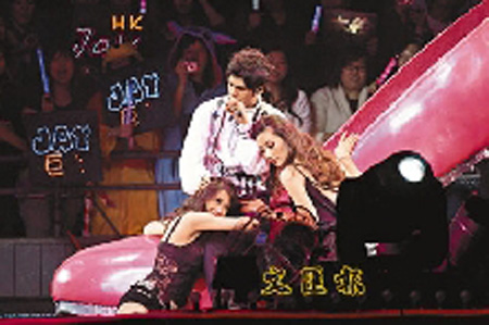 據(jù)香港文匯報報道,“周杰倫2007世界巡回演唱會”香港站的七場演出已于前晚大功告成,周杰倫獻唱《夜曲》時,名模姚書軼和另一性感舞蹈員從旁伴舞,她們不停做出誘惑動作,不僅掃摸他身體,更甚是伸手在周杰倫的大腿內(nèi)側(cè)位置掃過去,差點觸及周杰倫重要部位,周杰倫被嚇得用手撥開對方。最搞笑是立刻以手掩護住下,可能周杰倫給熱情的女伴舞者所帶動,隨之開放起來,當女伴舞者把頭躺在周杰倫的大腿時,他索性把對方的頭按下,差點觸碰到下體,令現(xiàn)場觀眾叫囂不絕。