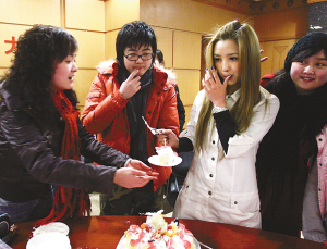 一位從事幼教工作的“盒飯”說很喜歡熱舞《BOYS》,閑暇還教小朋友們跳,何潔立刻調皮地說:“不會帶壞小孩子吧。”為慰問偶像,粉絲們還專門定制了印有何潔頭像的奶油蛋糕,可惜何潔怕破壞瘦身計劃,不敢品嘗。但為安慰粉絲,她還是親自切開蛋糕,分給大家大快朵頤。