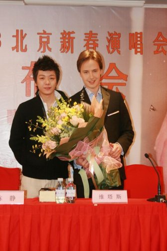 中新網(wǎng)1月24日電 “俄羅斯第一高音王子”Vitas今晚(1/24)將于北京首都體育館舉行“王者歸來 Vitas新春演唱會”,昨天下午他于北京舉行記者會時,曾以演唱Vitas代表作《Opera2》的超人氣“海豚音小王子”王櫟鑫特別到場與偶像相見歡,而Vitas的魅力讓總是活蹦亂跳的王櫟鑫突然害羞了起來,卻還是忍不住用練習(xí)多時的俄語對他大呼“我愛你”!