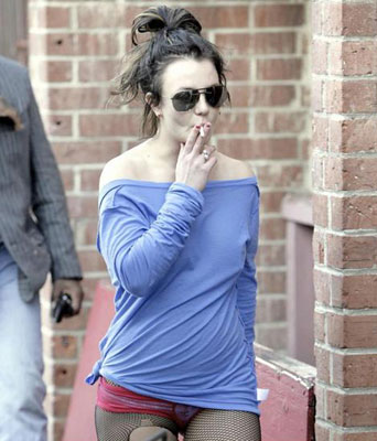 布蘭妮一點(diǎn)都不在乎自己的形象,不但衣服的下擺撕裂,還穿著帶破洞的漁網(wǎng)絲襪,露肩裝也過于暴露。下面只穿了一件紅色超短褲,短得不能再短。