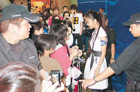 現(xiàn)場吸引逾百歌迷和途人圍觀,非常熱鬧!Fiona雖然是傳媒焦點,但聲勢卻不及Janice Man強勁,其Fans還提早到場霸好前排有利位置,而Fiona的Fans被擠出外圍,只能在后排高舉海報助威,儀式結束后,F(xiàn)iona即主動走近圍欄替他們簽名合照,挽回人氣。