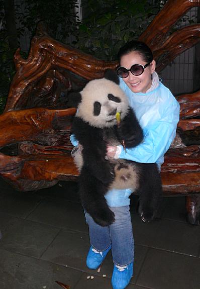 除了醫(yī)院探病獻愛心外,劉若英這次四川行程,也趁空去看了中國國寶大熊貓。當被告知園方開特例允許她真正擁抱一下小熊貓的時候,她受寵若驚,又怕自己承受不住熊貓的重量!皼]想到熊貓沒有想象得重,只是毛很松軟!蹦滩柽偷偷摸熊貓大腿,發(fā)現(xiàn)真的摸不到骨頭。