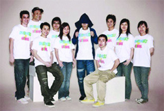 陳冠希(中)現(xiàn)身為自創(chuàng)服裝品牌拍宣傳照,但以帽遮面。