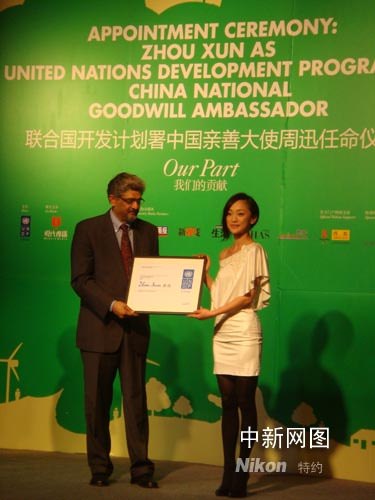 中新社北京四月二十一日電(記者 阮煜琳)聯(lián)合國開發(fā)計(jì)劃署今天北京宣布,任命著名藝人周迅為首位聯(lián)合國開發(fā)計(jì)劃署中國親善大使,致力于推動環(huán)境的可持續(xù)發(fā)展。
