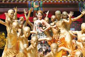 昨日的簽約地點(diǎn)選在什剎海會(huì)館,三面環(huán)水,位于白米斜街的東側(cè)(古時(shí)說法是水為“財(cái)”,糧為“富”),祝愿與蕭亞軒合作財(cái)源廣進(jìn)。開場(chǎng)時(shí)大屏幕首先播放蕭亞軒的歌迷們錄制的一段VCR,將貼滿水鉆的鳳冠,分別捧到北京的天壇、地壇、日壇、月壇四地為蕭亞軒祈福。隨后,少林寺出身的武術(shù)高手“十八銅人陣”威風(fēng)出場(chǎng),蕭亞軒喜上眉梢地從“十八銅人”中走出,寓意她將以銅墻鐵壁勇闖天下。