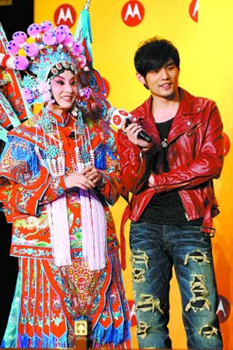 由周杰倫代言的摩托羅拉推出新款手機(jī),不僅請(qǐng)到周杰倫,而且還邀請(qǐng)了京劇演員、變臉演員等進(jìn)行表演。其中一名扮演“穆桂英”的女演員表示自己是周杰倫的“粉絲”,而周杰倫也饒有興趣的向這位京劇演員學(xué)唱“穆桂英掛帥”當(dāng)中的經(jīng)典選段,還表示想借“穆桂英”的行頭來穿穿。最后,周杰倫和“穆桂英”不僅共同演唱了改了詞的京劇,還一起用京劇的唱法合唱了周杰倫的名曲《千里之外》。對(duì)京劇流露出濃厚興趣的周杰倫聲稱:“我考慮在我的演唱會(huì)中加入京劇的元素。要是上萬人一起合唱京劇,實(shí)在是很酷!