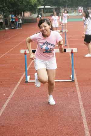 而接下來的跨欄更是讓人笑彎了腰,除了大牙和小蠻這兩個身高腿長的美眉能一跨而過,其他人都是慢吞吞地“走欄”——一腳跨過去,站定后另一腳才跨,特別是MeiMei,跑步的笨拙姿勢讓大家大笑不已。而到跳高時,鬼鬼幾乎是連攀帶爬,姿勢十分狼狽,難得她躍過后還露出自信的微笑。而筱婕、小蠻和Apple都是雙手攤平,企圖正面跳過去,可是每次都落得個肚子壓住橫竿的結(jié)局,被黑人揶揄為“狗爬式!