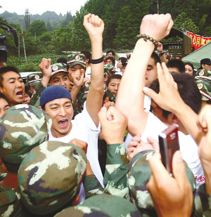 經(jīng)過(guò)兩個(gè)小時(shí)的車程,劉德華一行抵達(dá)了向峨鄉(xiāng)的救援部隊(duì)駐地。得知?jiǎng)⒌氯A等人要來(lái),數(shù)千戰(zhàn)士已在那里等候?吹矫餍,平靜的現(xiàn)場(chǎng)沸騰起來(lái)。為了維持秩序,士兵們自覺(jué)地手拉手圍成一個(gè)圈,把明星們圍在里面。