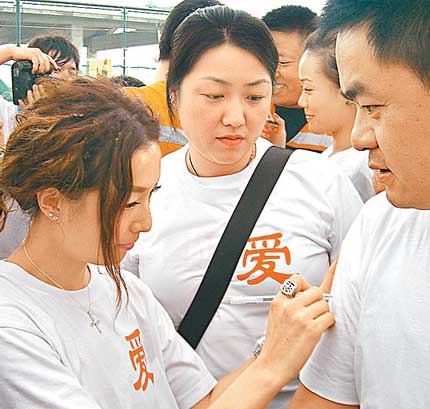 至下午3時(shí)多,他們到成都一間消防局為數(shù)百名消防員打氣,他們是首批進(jìn)入災(zāi)區(qū)徒手在瓦礫中救出幾百名傷者的英雄,華仔和Sammi帶頭向這班消防英雄敬禮。Sammi說:“第一隊(duì)人入災(zāi)區(qū)以血汗救人,這些人是真英雄!比A仔則說:“5.12地震發(fā)生后,我先知道內(nèi)地消防員是這樣,她們不顧自己安危,我真是好敬佩。”