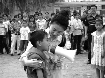 6月1日一早,央視節(jié)目主持人王小丫出現(xiàn)在地震災區(qū)彭州市慶興小學的操場上,與災區(qū)孩子們一起慶!傲粌和(jié)”的畫面。王小丫胸前戴著一張“有希望就有未來”的愛心卡,教災區(qū)孩子們畫笑臉,和孩子們疊紙飛機、唱歌、做游戲,還給孩子們做心理輔導。