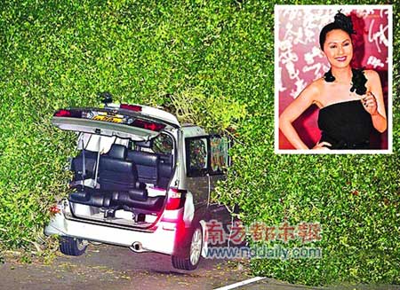 楊千嬅乘坐的私家車被一棵15米高的大樹砸中,而人卻沒事,非常幸運。