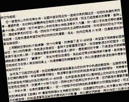 綜合臺(tái)灣媒體消息,日前林志玲與林宇中在酒店“親吻照”在網(wǎng)絡(luò)瘋傳,該爆料者還欲以300萬(wàn)臺(tái)幣高價(jià)拍賣(mài)兩人更多的親密照,將這段似是而非的戀情推向最高潮。就在事態(tài)變得撲朔迷離之際,該名爆料者于24日在臺(tái)灣人氣論壇發(fā)表了《致林志玲姐姐的道歉信》,就自己的所作所為向林志玲和林宇中表示道歉,這封道歉信還向人們解開(kāi)了林志玲酒店“親吻照”和遭遇“咸豬手”事件背后的諸多疑問(wèn)。