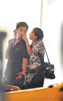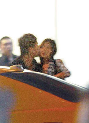 3小時后他與長腿妹離開,看來已有酒意,在路邊等車時,長腿妹在大馬路上張開雙手抱他,深情對望,惹火身材直接貼上去,還在他耳朵吹氣講悄悄話,動作挑逗,他也沒抗拒,回吻長腿妹。