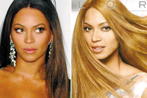 現(xiàn)年26歲的碧昂絲一身古銅滑溜肌膚,曾被譽為性感象征,碧昂絲的父親是美籍非裔,母親則是法國混血,因此膚色雖不算太黑,卻也是健康的巧克力色。但她最近為歐萊雅染發(fā)劑擔(dān)任代言人,變化的不僅是她的發(fā)色,媒體發(fā)現(xiàn)原本有黑人血統(tǒng)的她,膚色疑遭美術(shù)人員以電腦“漂白”,看上去幾乎已快要像個白人。