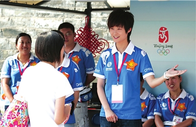 短短一個小時內(nèi),李宇春接待了多名游客,除了解答交通問題,她還給游人們介紹當天的奧運賽事信息。一位老人推著三輪車經(jīng)過咨詢臺時,李宇春和同伴快步上前幫老人推車。李宇春說:“剛上崗的時候還是很緊張的,生怕自己做不好,不過顧慮很快就打消了。因為我有什么不明白的地方,身邊的志愿者都會幫我解答!绷硗,歌手譚晶昨天出現(xiàn)在鳥巢8號安檢口旁的志愿者服務(wù)站。她與其他幾名志愿者一起,為游客提供咨詢服務(wù)。