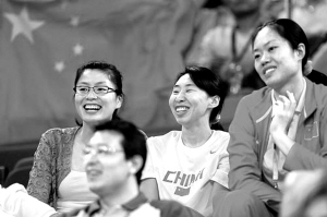 葉莉和前隊(duì)友苗立杰坐在一起,戴著眼鏡的葉莉一直在默默為姚明加油。不過當(dāng)中國男籃最終大比分輸?shù)舯荣惡,葉莉的神色也有些黯然……