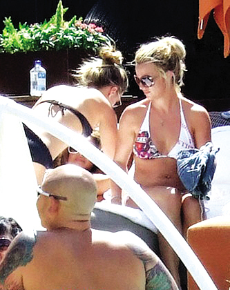 上周日,布蘭妮亮相度假村內的游泳池邊,享受周末午后時光。身穿性感比基尼的她依舊是粗腰肥臀,身材無改善,兩位身材健碩的保鏢如影隨形地保護她的安全。