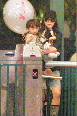前晚8時(shí),張柏芝抱著兒子步出迪斯尼時(shí),手上拎著5大袋戰(zhàn)利品,其中米老鼠布偶還被張柏芝抱在手上,而Lucas則是手拿巨型變色氣球玩?zhèn)不停。