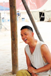 穿了馬褂、全身都已涂得黝黑,昨天出現(xiàn)在橫店片場(chǎng)的潘粵明儼然一副40年代軍人的打扮。他在影片中扮演了舞美隊(duì)長(zhǎng),是一個(gè)性格純樸、待人耿直的人,來不及卸妝的潘粵鳴接受記者采訪時(shí)也是有問必答,照實(shí)全說。