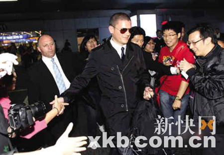 在首都機場T2航站樓,米勒的黑人保鏢率先出現(xiàn),帶領(lǐng)一批人馬直奔停車樓,并對粉絲們言簡意賅地交待說:“不要握手,不要拉扯和擁擠。”不料,米帥這次跟《越獄》中一樣,調(diào)虎離山,從另一邊的電梯口出現(xiàn)了。媒體和粉絲見狀立即“追捕”過去,將米勒團團圍住,相機快門聲不停地響起,粉絲爭相喊“邁克”,并伴著十分奔放的“Iloveyou”一路將其送上了保姆車。夜色中,粉絲們自駕車,跟著米勒的保姆車在北京的機場高速上“狂飆”。