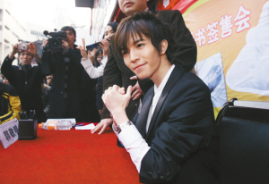 郭敬明一出現(xiàn),粉絲們開(kāi)始躁動(dòng),手機(jī)、相機(jī)照相的咔嚓聲和“不要擠不要擠”的尖叫聲此起彼伏。簽售正式開(kāi)始。排在第一位的小女生飛快地沖了上來(lái),她遞上了幫別人帶的禮物盒,興奮地看著“郭敬明”三個(gè)字落在書(shū)的扉頁(yè)上。女生還想讓郭敬明給自己寫(xiě)一段話,只可惜沒(méi)能得逞,因?yàn)楹竺娴群虻娜藢?shí)在是太多了。