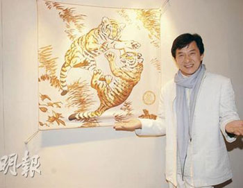成龍與某品牌合作推出老虎圖案的限量版絲質(zhì)披肩,將會在香港義賣籌款。(圖片來源:明報)
