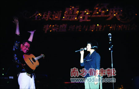 張艾嘉的出現(xiàn)令觀眾極為興奮。這個被李宗盛稱為“大姐”的女人一上臺就調(diào)侃李宗盛:“在歌壇里,小李是我的最愛,那你的最愛是誰?”讓李宗盛無言以對。她唱起了《我這樣愛你到底對不對》、《因為寂寞》,還不忘輕松地在舞臺上表現(xiàn)兩個人的友情:“你們看過小李演的電影沒有?他演的多數(shù)是喜劇,悲劇也能演成喜劇,每次都演我的丈夫或者男朋友,唉,我真的很不幸……”此外她還逼問:“你的歌都很浪漫,不知道你是不是一個浪漫的男人?”李宗盛據(jù)實以答:“把渴望而不可得的寫入歌中,我的實際人生很沉悶的!睆埌巫詈蠛鼙挤诺貏裾f他:“再找個好點的,再生個妞。”記者 齊帥 攝影 馬強