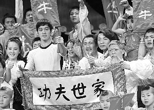 一部《李小龍傳奇》讓陳國坤成為2008年人氣最旺的演員之一,由他參演的滑稽舞蹈《功夫世家》也是昨天彩排中人氣最高的節(jié)目,雖然以李小龍裝扮出現(xiàn)的陳國坤表演“雙截棍”的時候,觀眾席上前排一位一直在玩游戲機(jī)的小男孩也看得拍起手來!豆Ψ蚴兰摇返娘L(fēng)格相當(dāng)搞笑,演員們有的穿著睡衣,拿著飯鍋、菜板等道具,在一起“比武”。節(jié)目里面的人物很多“借鑒”自周星馳的電影作品,造型怪異,但卻個個功夫高強(qiáng),甚至《功夫》里的戴著“燙發(fā)卷”的“包租婆”也出場“搞笑”了。陳國坤在《功夫世家》中最后亮相,他除了表演雙截棍外,還要用拳和腿分別擊開兩塊木板。雖然是以舞蹈節(jié)目的形式出現(xiàn),《功夫世家》在現(xiàn)場贏得的笑聲并不比演員類節(jié)目少。