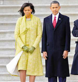 新任美國(guó)總統(tǒng)奧巴馬的妻子米歇爾在典禮上的穿著,時(shí)尚界評(píng)價(jià)不一,設(shè)計(jì)師托雷多說(shuō),黃色并非政治場(chǎng)合的傳統(tǒng)顏色,不過(guò)它傳達(dá)了希望與樂(lè)觀的意象。托雷多說(shuō),她是用瑞士羊毛蕾斯混法國(guó)絲的布料,裁制那套衣服,黃色代表陽(yáng)光。