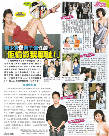 今年39歲的蔡子健,進入演藝圈之前曾當過救生員、福利工作者、平面設(shè)計師、旅行團領(lǐng)隊和保險經(jīng)紀等,1993年加入無線藝員訓練班,拍完情景劇《開心華之里》后不久便被調(diào)去主持《閃電傳真機》節(jié)目,之后拍過無數(shù)旅游特輯,故有“旅游王子”之稱。因經(jīng)常出差,他愛上攝影。據(jù)資料顯示,2001年,蔡子健與蔡少芬合拍《陀槍師姐3》時,兩人演夫妻拍一場婚紗戲。當時蔡少芬不經(jīng)意地大爆蔡子健的怪癖:“子健人不錯,很懂得照顧人,還整天幫我照相,有一次還偷拍我的腳趾!”據(jù)知,拍劇時,蔡少芬經(jīng)常貪舒服穿著拖鞋到處走,其修長的美腿和腳趾引起蔡子健的興趣,所以拍下來作收藏。近日,記者就此事詢問蔡少芬,但據(jù)悉無線已下令藝員“封口”,蔡少芬對關(guān)于蔡子健的問題立即裝聾扮啞,拒絕作答。