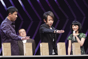 還是春晚那身打扮,劉謙不停給場下高呼他名字的粉絲放電,引發(fā)了一陣陣的尖叫聲。第一次上場,劉謙就用紙巾變成了一條彩帶,并讓彩帶從空中飛出去,把康洪雷導(dǎo)演接到了臺上。不過這只是略施小技,為了考驗(yàn)康洪雷手下的膽量,劉謙用了五個紙盒,當(dāng)著眾人的面在其中一個中藏了一個破碎的啤酒瓶,然后讓演員們用力去擊打。還好,經(jīng)過劉謙的“施法”,最后并沒有一人受傷,不過倒把現(xiàn)場觀眾嚇出一身冷汗。最后,劉謙把兩個“團(tuán)”字變成了一張《我的團(tuán)長我的團(tuán)》的海報,就完成自己的這次走穴任務(wù)。