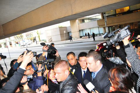 陳冠希在經(jīng)理人陪同下,抵達(dá)溫哥華高等法院應(yīng)訊,經(jīng)理人表示,原先法庭考慮陳冠希的安全,計(jì)劃安排他在停車場直接進(jìn)入法庭,不過經(jīng)與陳冠希商量后,決定由正門進(jìn)入,以顯示陳對(duì)此宗案件坦然面對(duì)。