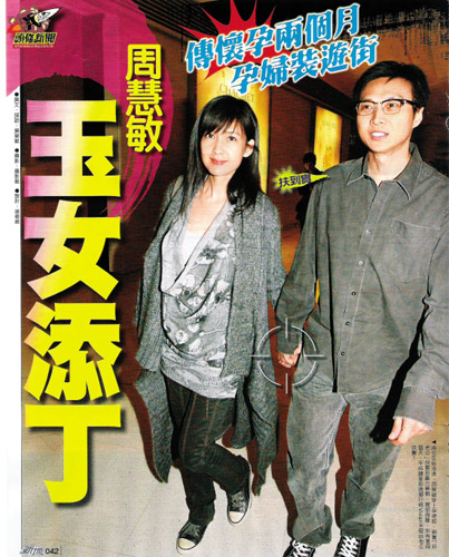 據(jù)昨日出版的某香港周刊爆料,周慧敏近日出席活動時被發(fā)現(xiàn)肚子凸起疑似有喜,而上周該周刊記者又在街上撞見她身穿孕婦裝偕夫出游,似乎新婚不足兩個月已“好事成雙”。有傳言指,原來在“倪震濕吻事件”發(fā)生后不久,周慧敏已發(fā)現(xiàn)自己“有喜”,這才是令倪震戲劇性浪子回頭的最大原因。