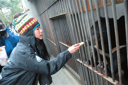 莫文蔚2004年3月成為亞洲動物基金“拯救黑熊愛心大使”,隨后,只要她到成都,一定要抽出時間前往黑熊救護中心。這次來成都參與震后的公益慈善活動,莫文蔚昨日一大早就來到了救護中心!皩氊悆骸笔2005年初莫文蔚認養(yǎng)的一只取膽黑熊,經(jīng)過工作人員4年的精心照料,“寶貝”早已康復。當莫文蔚來到“寶貝”的喂養(yǎng)間時,“寶貝”似乎認識恩人,一看到莫文蔚就活蹦亂跳。莫文蔚也開心不已,還把特意帶來的水果蘸上蜂蜜喂給“寶貝”(上圖)。昨日莫文蔚還看望了最新救助的12頭黑熊以及棕熊“凱撒”,一路上笑聲不斷。