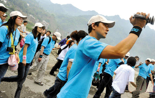 到了牛眠溝終點(diǎn)后,眾明星紛紛跟隨李連杰登上之前已搭好的舞臺,完成最后的儀式。來自映秀的羌族婦女為李連杰掛上了蘊(yùn)含著祝福之意的羌紅。這時(shí),主持人宣布當(dāng)天共有一百萬網(wǎng)民通過網(wǎng)絡(luò)進(jìn)行了虛擬行走,以此支持“壹家人,壹起走”活動(dòng),并現(xiàn)場成立了“志愿聯(lián)盟”。最后,在李連杰的帶領(lǐng)下,全場200多人默哀一分鐘,以表示對逝者的懷念。(王尚)
